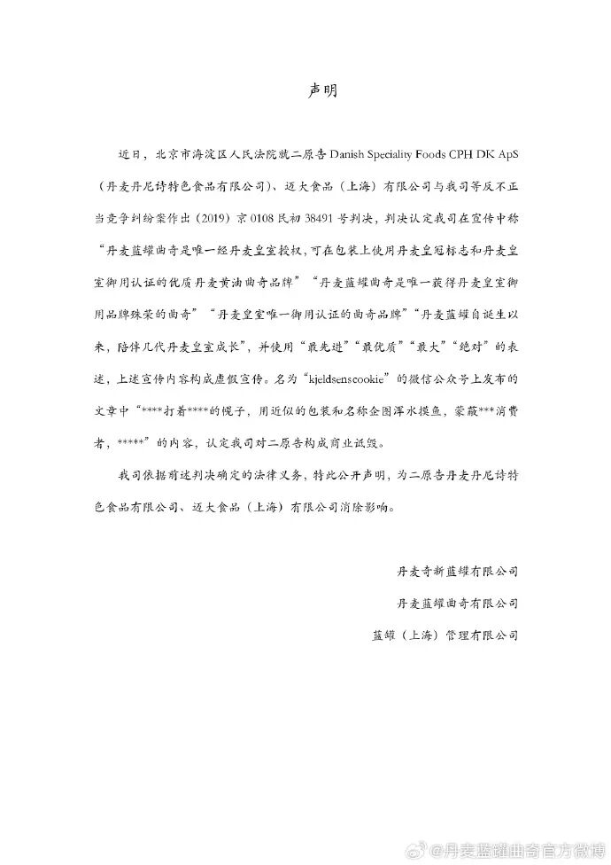 蓝罐曲奇声明2019年,“皇冠曲奇”的出品方丹尼诗公司、中国大陆地区经销商迈大公司向海淀法院提起不正当竞争纠纷之讼,指控“蓝罐曲奇”的生产商、进口商及经销商Kelsen Group A/S(丹麦奇新蓝罐有限公司,下称“奇新公司”)、Kjeldsens Limited(丹麦蓝罐曲奇有限公司,下称“蓝罐香港公司”)、蓝罐(上海)管理有限公司(下称“蓝罐上海公司”)、上海荔之实业有限公司(下称“荔之公司”)等,在其产品包装、官方线上店铺、官方网站、官方微博及微信公众号、其他宣传物料中进行虚假宣传,并在其新闻发布会、官方微博及微信公众号、官方线上店铺中对“皇冠曲奇”进行商业诋毁。经与“皇冠曲奇”方联系,知产财经(IPEconomy)获取了该案的判决内容,北京市海淀区人民法院根据双方陈述及在案证据,就各被告的涉案被诉虚假宣传行为与商业诋毁行为是否成立作出如下认定:(一)关于被诉虚假宣传行为:判决认为,三被告奇新公司、蓝罐香港公司、蓝罐上海公司关于“最 先进的设备、制作最 优质的产品”“全球最大之现代化曲奇生产线”“丹麦蓝罐自诞生以来,陪伴几代丹麦皇 室成长”等表述,容易导致相关公众误认为“蓝罐曲奇”品质卓 越、质量等高于其他同类产品,损害了二原告作为直接竞品经营者的经营利益,构成虚假宣传。(二)关于被诉商业诋毁行为:“丹麦蓝罐曲奇”微信公众号于2015年发布的文章载明“现在市面上有一些打着‘蓝罐’的幌子,用近似的包装和名称企图浑水摸鱼,蒙蔽心爱奇奇的消费者,让大家误以为这只是丹麦蓝罐曲奇的优惠装或兄弟品牌”,文章中配图将二原告生产的“皇冠曲奇”与“蓝罐曲奇”放在一起对比。判决认为,上述被诉内容中的图片结合其被诉文字内容极易使相关公众认为被诉内容所指向的对象即为二原告产品,极易误导消费者认为二原告的“皇冠曲奇”产品故意使用近似包装欺骗消费者,对二原告的产品声誉造成损害,构成商业诋毁。综上,法院综合考虑二原告经营的“皇冠曲奇”产品及三被告经营的“蓝罐曲奇”产品的知名度和市场份额、涉案侵权行为的持续期间、规模及后果、各被告的主观过错等情节,于今年6月28日作出判决:各被告立即停止涉案虚假宣传及商业诋毁行为;被告奇新公司、蓝罐香港公司、蓝罐上海公司在其官方网站和官方微博连续三日刊登声明、消除影响,并共同赔偿二原告经济损失500,000元及合理开支50,000元,被告荔之公司就上述赔偿责任中的100,000元承担连带赔偿责任。
