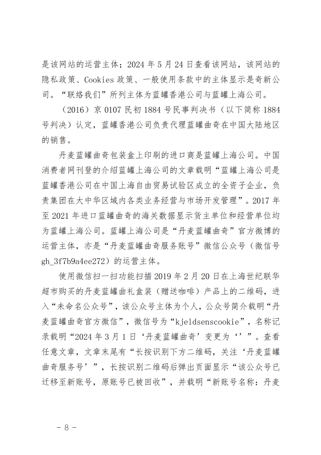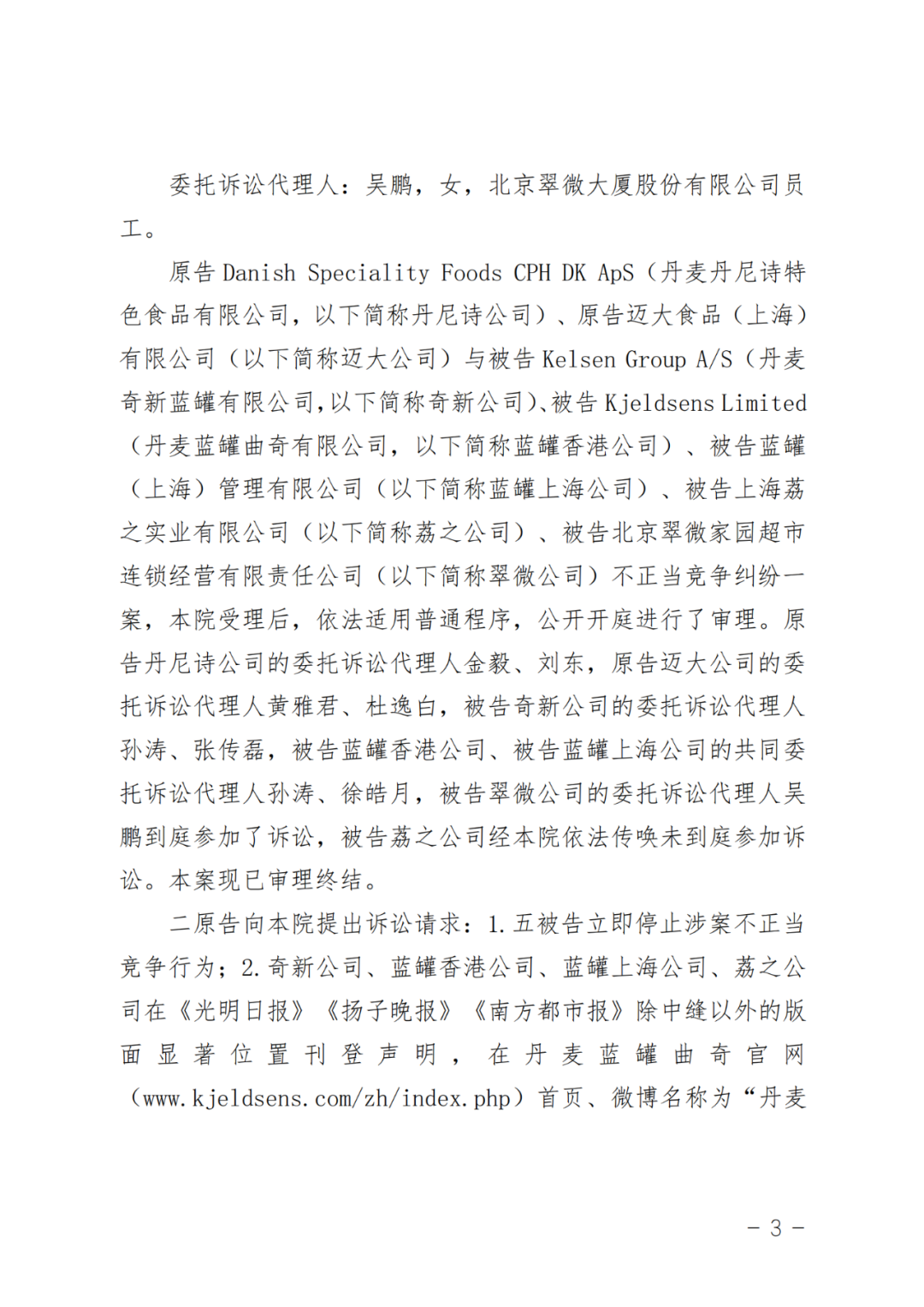 蓝罐曲奇声明2019年,“皇冠曲奇”的出品方丹尼诗公司、中国大陆地区经销商迈大公司向海淀法院提起不正当竞争纠纷之讼,指控“蓝罐曲奇”的生产商、进口商及经销商Kelsen Group A/S(丹麦奇新蓝罐有限公司,下称“奇新公司”)、Kjeldsens Limited(丹麦蓝罐曲奇有限公司,下称“蓝罐香港公司”)、蓝罐(上海)管理有限公司(下称“蓝罐上海公司”)、上海荔之实业有限公司(下称“荔之公司”)等,在其产品包装、官方线上店铺、官方网站、官方微博及微信公众号、其他宣传物料中进行虚假宣传,并在其新闻发布会、官方微博及微信公众号、官方线上店铺中对“皇冠曲奇”进行商业诋毁。经与“皇冠曲奇”方联系,知产财经(IPEconomy)获取了该案的判决内容,北京市海淀区人民法院根据双方陈述及在案证据,就各被告的涉案被诉虚假宣传行为与商业诋毁行为是否成立作出如下认定:(一)关于被诉虚假宣传行为:判决认为,三被告奇新公司、蓝罐香港公司、蓝罐上海公司关于“最 先进的设备、制作最 优质的产品”“全球最大之现代化曲奇生产线”“丹麦蓝罐自诞生以来,陪伴几代丹麦皇 室成长”等表述,容易导致相关公众误认为“蓝罐曲奇”品质卓 越、质量等高于其他同类产品,损害了二原告作为直接竞品经营者的经营利益,构成虚假宣传。(二)关于被诉商业诋毁行为:“丹麦蓝罐曲奇”微信公众号于2015年发布的文章载明“现在市面上有一些打着‘蓝罐’的幌子,用近似的包装和名称企图浑水摸鱼,蒙蔽心爱奇奇的消费者,让大家误以为这只是丹麦蓝罐曲奇的优惠装或兄弟品牌”,文章中配图将二原告生产的“皇冠曲奇”与“蓝罐曲奇”放在一起对比。判决认为,上述被诉内容中的图片结合其被诉文字内容极易使相关公众认为被诉内容所指向的对象即为二原告产品,极易误导消费者认为二原告的“皇冠曲奇”产品故意使用近似包装欺骗消费者,对二原告的产品声誉造成损害,构成商业诋毁。综上,法院综合考虑二原告经营的“皇冠曲奇”产品及三被告经营的“蓝罐曲奇”产品的知名度和市场份额、涉案侵权行为的持续期间、规模及后果、各被告的主观过错等情节,于今年6月28日作出判决:各被告立即停止涉案虚假宣传及商业诋毁行为;被告奇新公司、蓝罐香港公司、蓝罐上海公司在其官方网站和官方微博连续三日刊登声明、消除影响,并共同赔偿二原告经济损失500,000元及合理开支50,000元,被告荔之公司就上述赔偿责任中的100,000元承担连带赔偿责任。