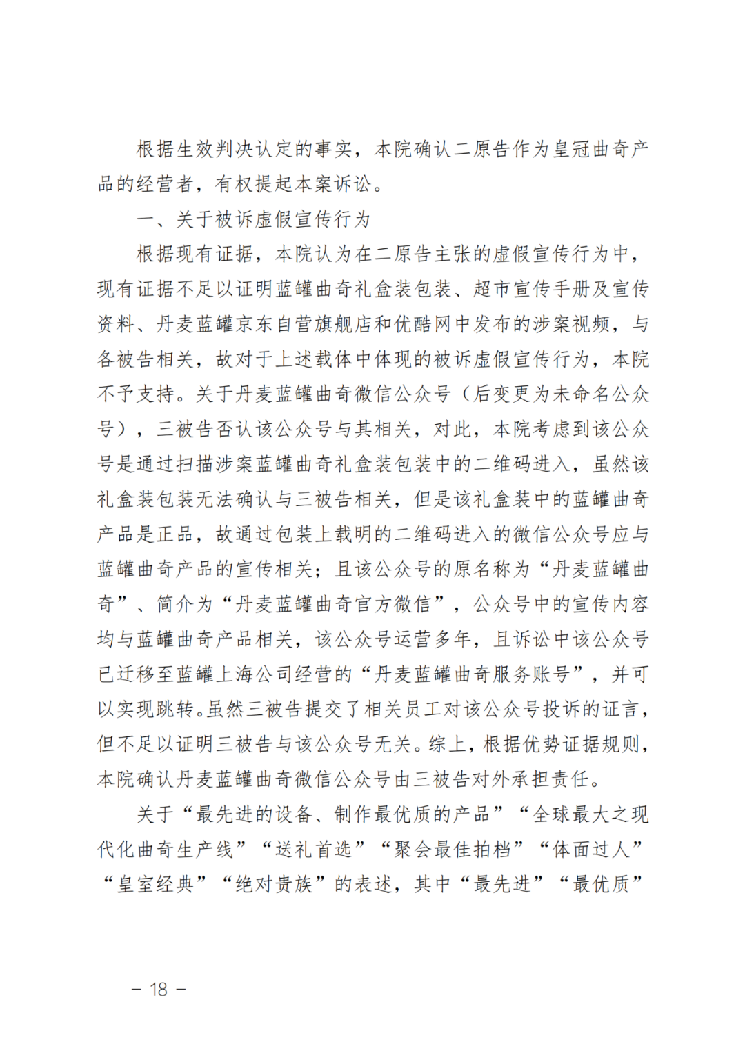 截至目前,各被告均未在上诉期内提起上诉,一审判决现已生效。如今,丹麦曲奇已成为一种曲奇品类,全球任何地区都可以生产丹麦样式、丹麦配方的曲奇饼干。由丹尼诗公司出品的“皇冠丹麦曲奇”自进入中国市场后,更是带动了中国消费者对于丹麦曲奇品类的深入认知。皇冠丹麦曲奇系丹麦品牌,产品以相同配方、生产工艺和原材料标准在丹麦和印尼生产。根据市场调查机构欧睿国际(Euromonitor)对2021年丹麦黄油曲奇风格(指用黄油制成并以组合品种及丹麦风格包装出售的曲奇)产品的全零售渠道统计,皇冠丹麦曲奇的销量高居第一[1]。由此可见,皇冠丹麦曲奇的“丹麦属性”是毋庸置疑的。我国《反不正当竞争法》第八条规定:“经营者不得对其商品的性能、功能、质量、销售状况、用户评价、曾获荣誉等作虚假或者引人误解的商业宣传,欺骗、误导消费者。”本案中,“蓝罐曲奇”生产、经销、运营商在宣传中多处使用最 高级的绝 对化宣传语,在缺乏具有绝 对说服力的证据支撑的情况下,此类宣传不仅违反了《反不正当竞争法》的上述规定,也为我国《广告法》第九条第三项所禁止。此外,“蓝罐曲奇”方宣称自身为“丹麦皇 室唯 一御用认证的曲奇品牌”,显然与中国市场中还存在另一获得丹麦皇 室御用认证的品牌“BISCA”的事实不符;“蓝罐曲奇”至2009年才取得现任丹麦皇 室御用认证,却宣传“丹麦蓝罐自诞生以来,陪伴几代丹麦皇室成长”,极易使相关公众误认为蓝罐曲奇已经取得几代丹麦皇室的御用认证。上述宣传表述或属于不符合客观事实的虚假信息,或属于“引人误解的商业宣传”,因而遭到了法院的依法规制。《反不正当竞争法》第十一条规定:“经营者不得编造、传播虚假信息或者误导性信息,损害竞争对手的商业信誉、商品声誉。”本案中,“蓝罐曲奇”方在宣传文章的配图中将“皇冠曲奇”与“蓝罐曲奇”并列对比,同时使用了“近似的包装和名称”以及“打着……幌子”“浑水摸鱼”“蒙蔽消费者”的表述。上述图片和文字结合,明确指向了竞争对手“皇冠曲奇”。同时,根据在先的生效判决,奇新公司(“蓝罐曲奇”生产商)曾主张迈大公司(“皇冠曲奇”经销商)仿冒其包装装潢,但该主张未得到法院支持。因此,无论就事实还是法理层面而言,“皇冠曲奇”均不构成对“蓝罐曲奇”包装和名称的摹仿;在此前提下,“蓝罐曲奇”方的上述行为将明确对“皇冠曲奇”方的产品声誉造成损害,因而构成商业诋毁。同为来自丹麦的曲奇品牌,“皇冠曲奇”与“蓝罐曲奇”早已在中国市场上并存多年,二者在中国消费者的认知中本可并行不悖、公平竞争,通过持续的产品研发和营销推广争夺市场份额,但不应越出法律轨道,作虚假、夸大、误导性宣传,更不得损害其他市场主体的合法权益。北京市海淀区人民法院的此番判决,再度为广大市场主体指明了虚假宣传及商业诋毁的行为边界;期望在未来的市场竞争中,竞争者能够坚守商业合规底线、尊重消费者知情权,以开诚布公的姿态迎接消费者的自由选择。1.Euromonitor International Limited,所有零售渠道,以零售价值计算的Danisa品牌份额;丹麦黄油曲奇风格被定义为用黄油制成并以组合品种及丹麦风格包装出售的曲奇,不分生产国家;2021年数据,研究于2022年1月至3月进行。